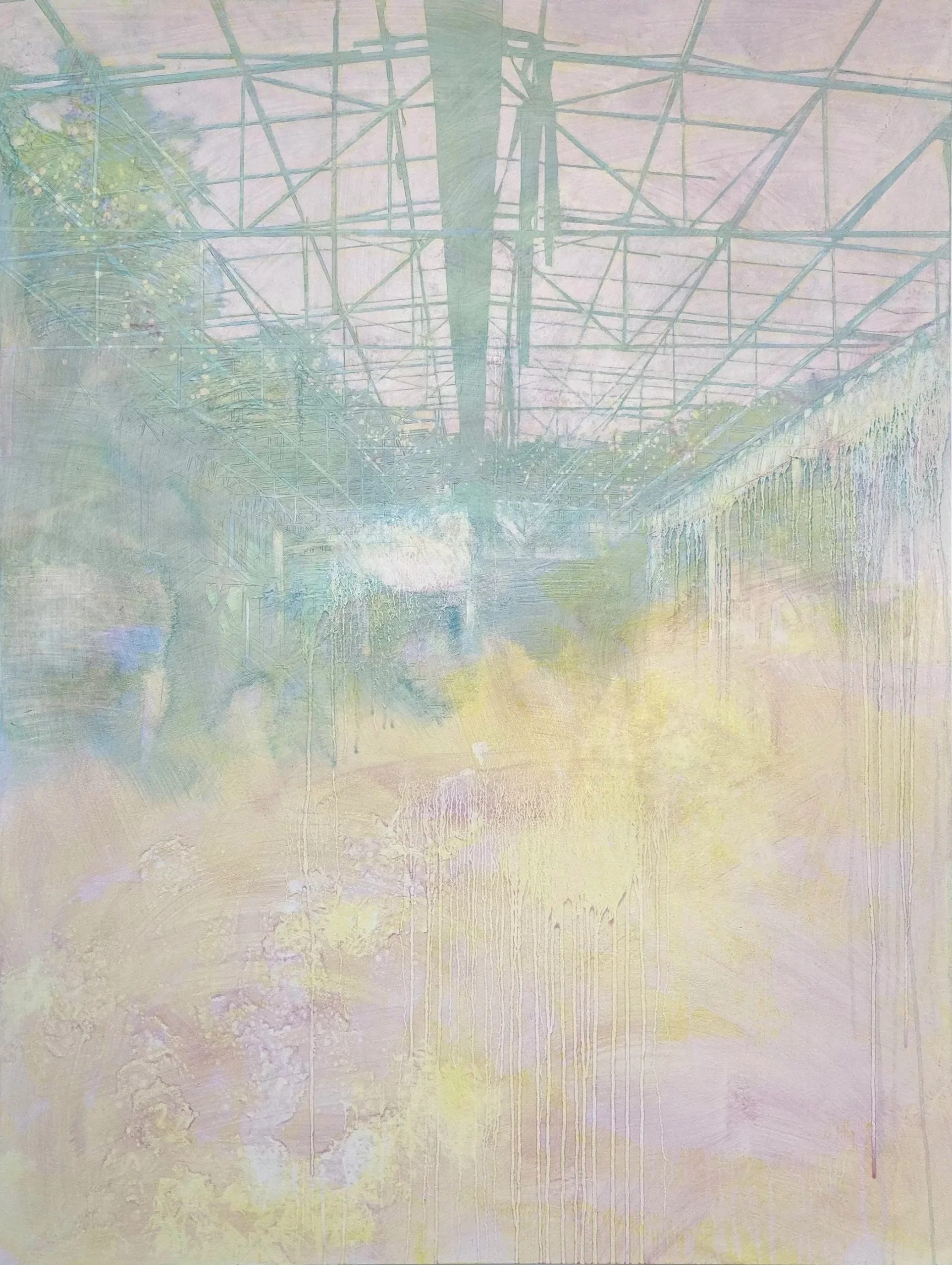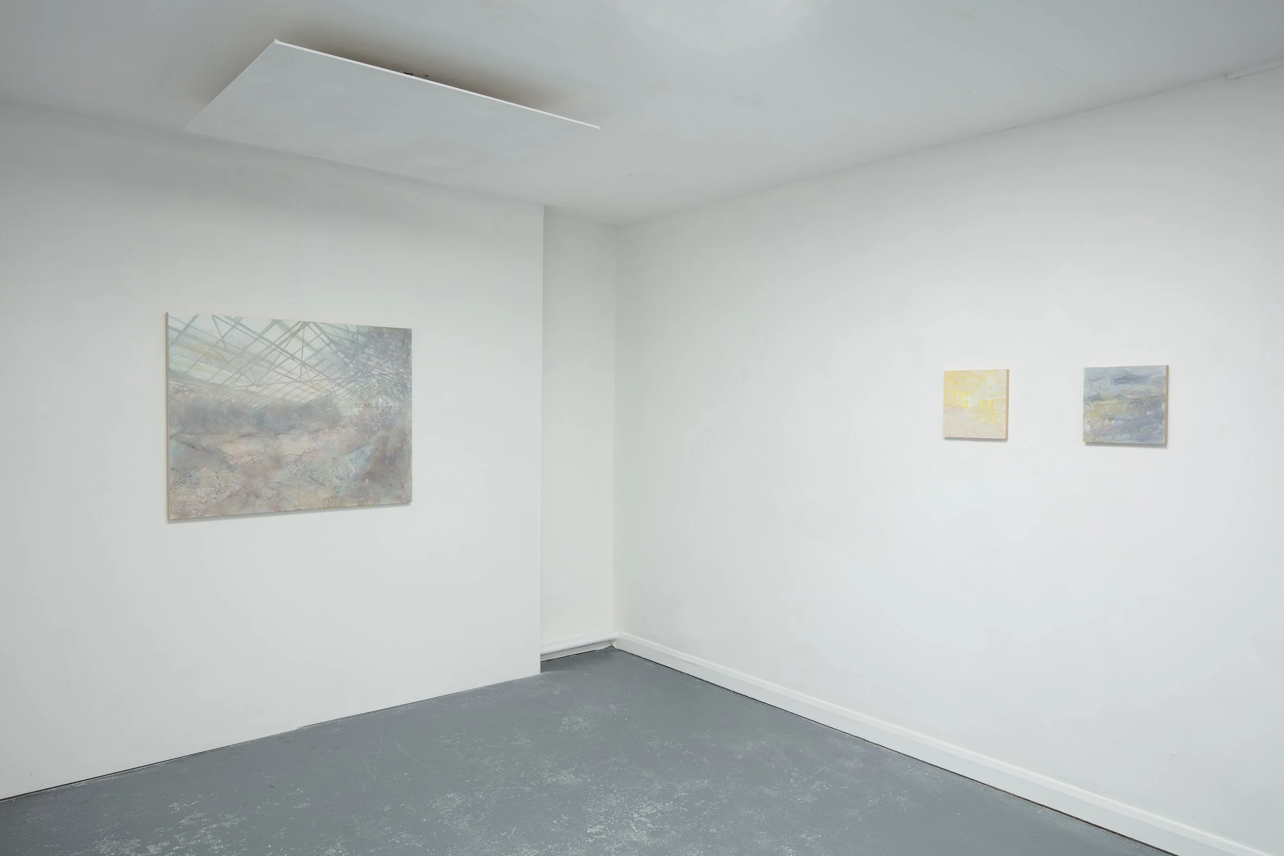 The work explores tensions between the painting’s image and surface, each serving to suppress the other. Oil paint is applied in thin, translucent glazes of colour and then, like palimpsests, wiped away to reveal previous layers. The clarity of the image can seem to oscillate, materialising briefly, before dissolving back into more abstract form. This precarious balance resists our attempts to fully locate, enter and navigate the space of the image, as though shrouded by a veil of mysterious uncertainty; instead leaving space for the viewer to project into the painting.
